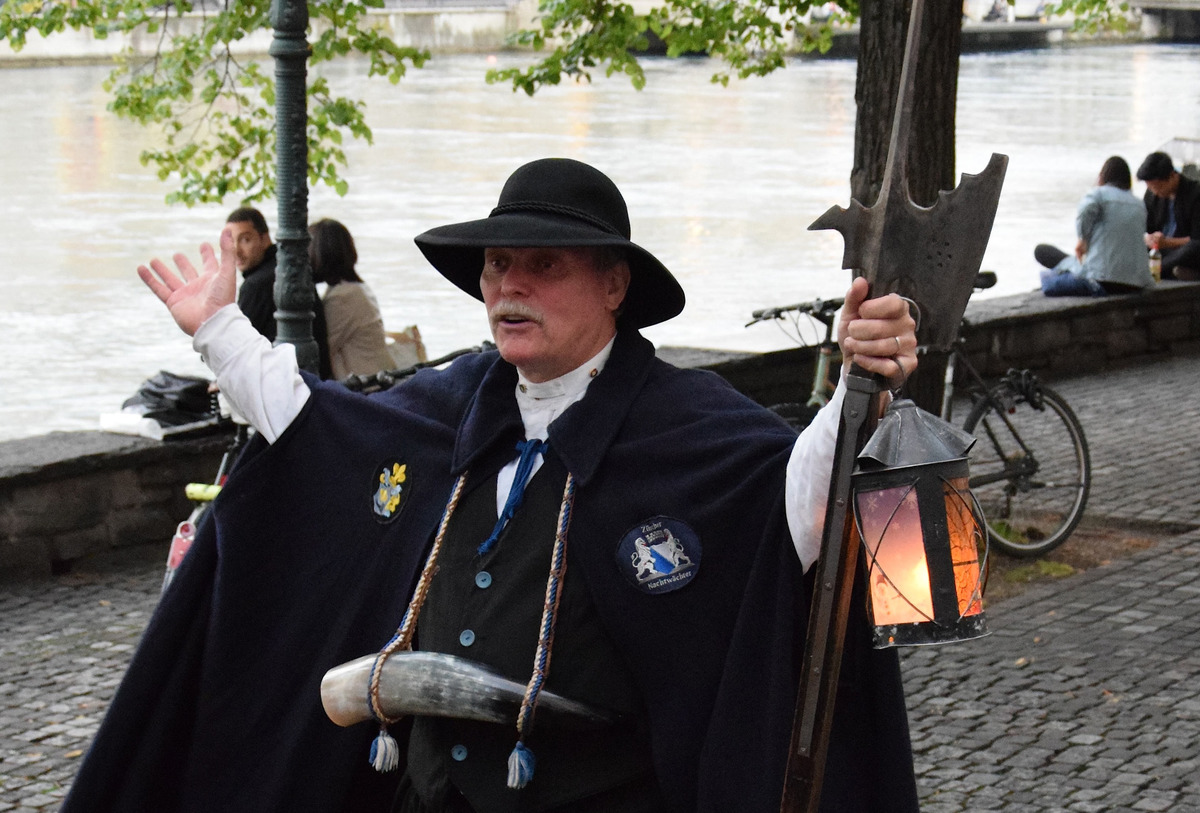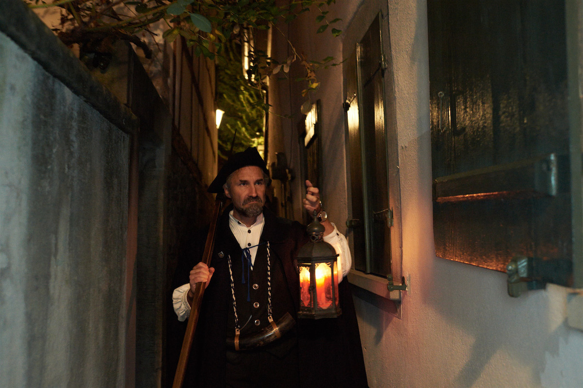 Der Nachtwächter erzählt seinen Zuhörern gar "schröckliche" Geschichten von Gerichtsurteilen, Hinrichtungen, Henkern und Hexen, Pest und Stadtbränden. Daneben auch allerlei Schmunzel-Anekdoten.